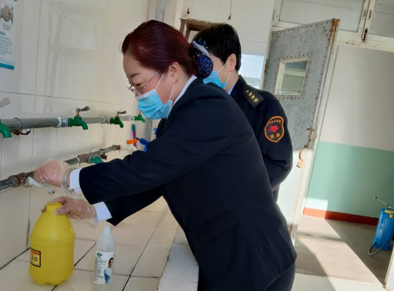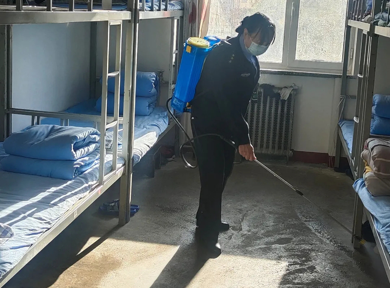 工作人员分工明确、操作规范,对学生公寓楼内的宿舍和学习室等区域喷洒84消毒液进行全面消毒。对师生经常接触到的门把手、窗台、桌椅进行了无死角擦拭消毒,特别是对垃圾桶周围、厕所等细菌容易滋生地方进行重点消杀。
