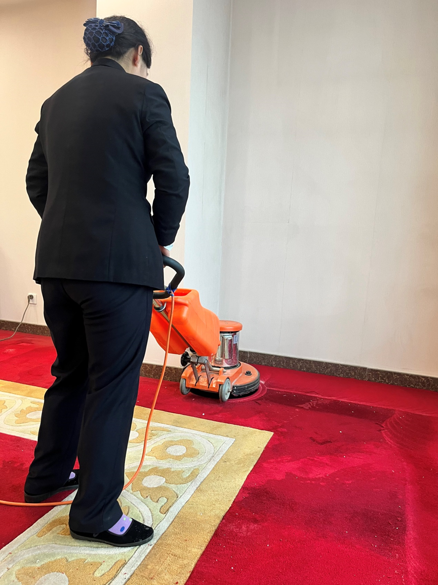 接待室是公安局对外交流的重要窗口,其环境的整洁程度直接影响着来访人员的第一印象。而地毯,作为接待室的重要装饰,经过长时间的使用,不仅积累了灰尘和污渍,还可能滋生细菌,影响室内空气质量。因此,项目处的物业团队决定对地毯进行一次全面而深度的清洗。