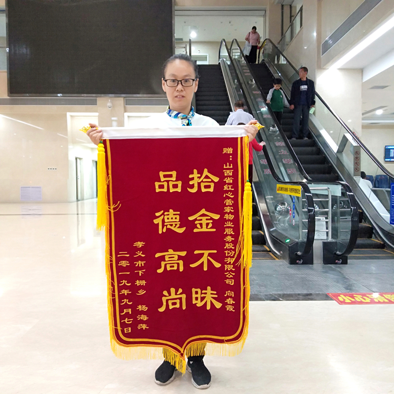 近日,孝义市下栅乡杨女士来到汾阳医院,将一面写有“拾金不昧,品德高尚”字样的锦旗赠送给红心管家员工向春霞,以此来感谢向春霞使她的钱包失而复得。
